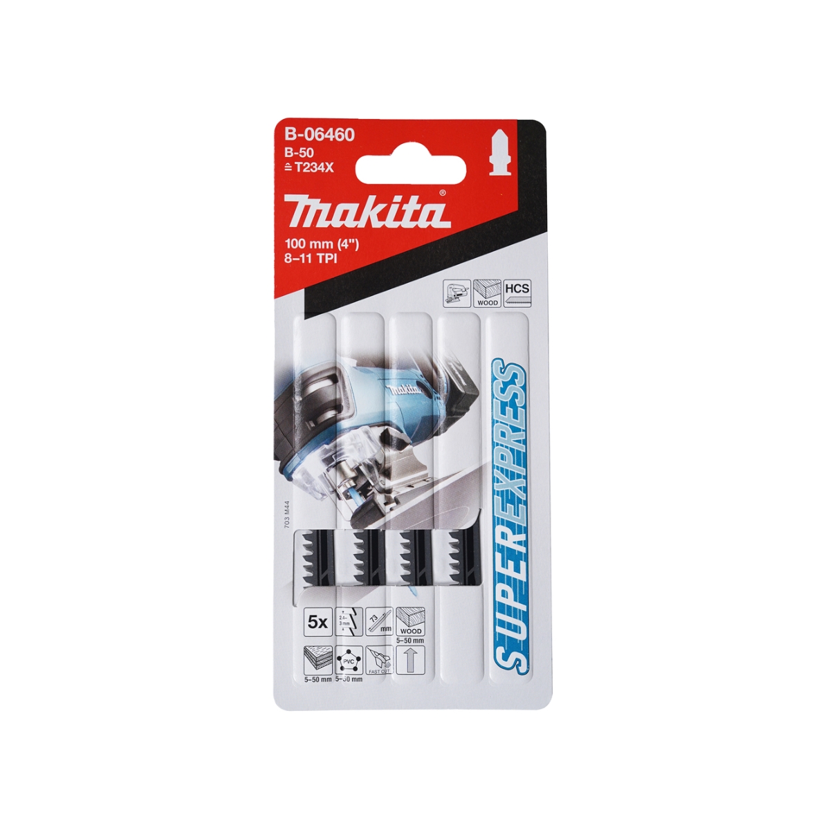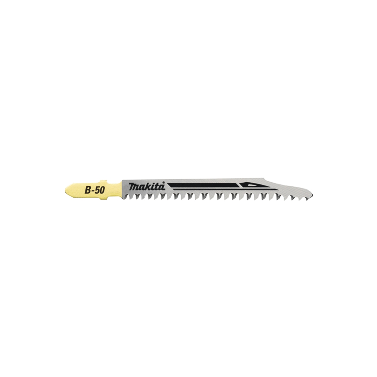Juego de 5 hojas de sierra de calar Makita tipo B-50, diseñadas para cortes rápidos y limpios en madera y plásticos. Fabricadas en HCS (acero con alto contenido de carbono), con dientes rectificados y afilados en forma cónica, permiten un avance eficaz incluso en materiales gruesos.